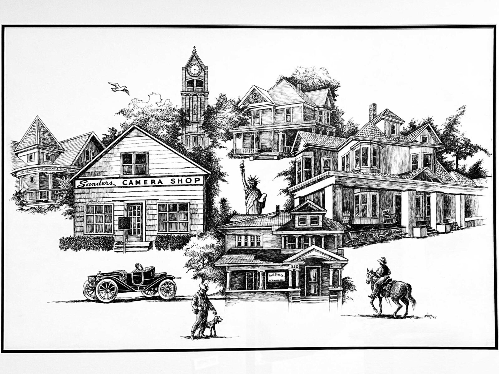 The pen and ink “Edmond Scenes” drawing was donated to the City of Edmond by artist Glover Shipp. This one-of-a-kind illustration portrays historic scenes and buildings from our community including the Old North clock tower and Sanders Camera Shop. In the center you can even see Edmond's very first sculpture, the replicated Statue of Liberty holding her torch up high. During his time as a missionary in Brazil, Shipp created pen and ink drawings inspired by their villages and later when he moved to Edmond, he continued making his incredibly detailed artworks. Glover Shipp is remembered as a man who 'broadened and sweetened our world' according to a Christian Chronicle article by Editor Bailey McBride.