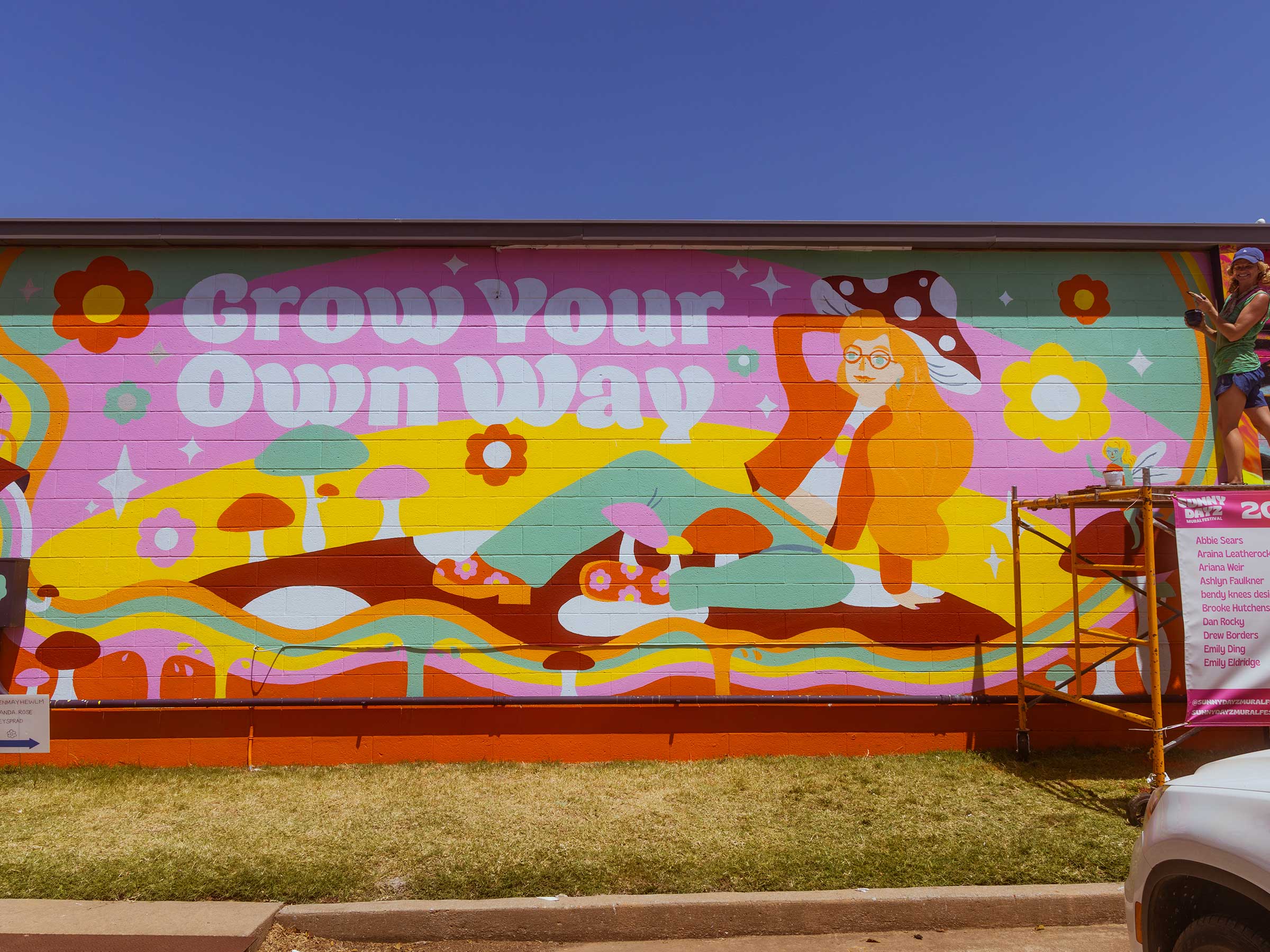 “Grow Your Own Way” by Wild Wallflowers (Hayley Spradlin, Lauren Mayhew, and Maranda Thrum.) Local artists that met while studying graphic design at UCO and have remained friends’ years after graduation. They describe their mural style as bright, whimsical, and a bit rebellious. This mural was one of fifteen murals added to the public art collection during the Sunny Dayz Mural Festival in Edmond in 2022; a total of thirty-one murals were installed. The mission Sunny Dayz Mural Fest is to empower, elevate, and celebrate women and nonbinary artists through the creation and advocacy of public art. Although women make up nearly 50% of working artists, they are underdog in the arts. Prior to the Sunny Dayz Mural Festival only 14% of Edmond’s murals were by women.