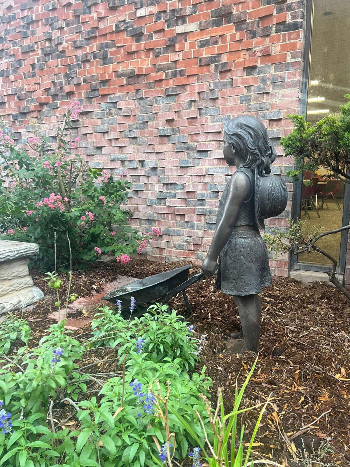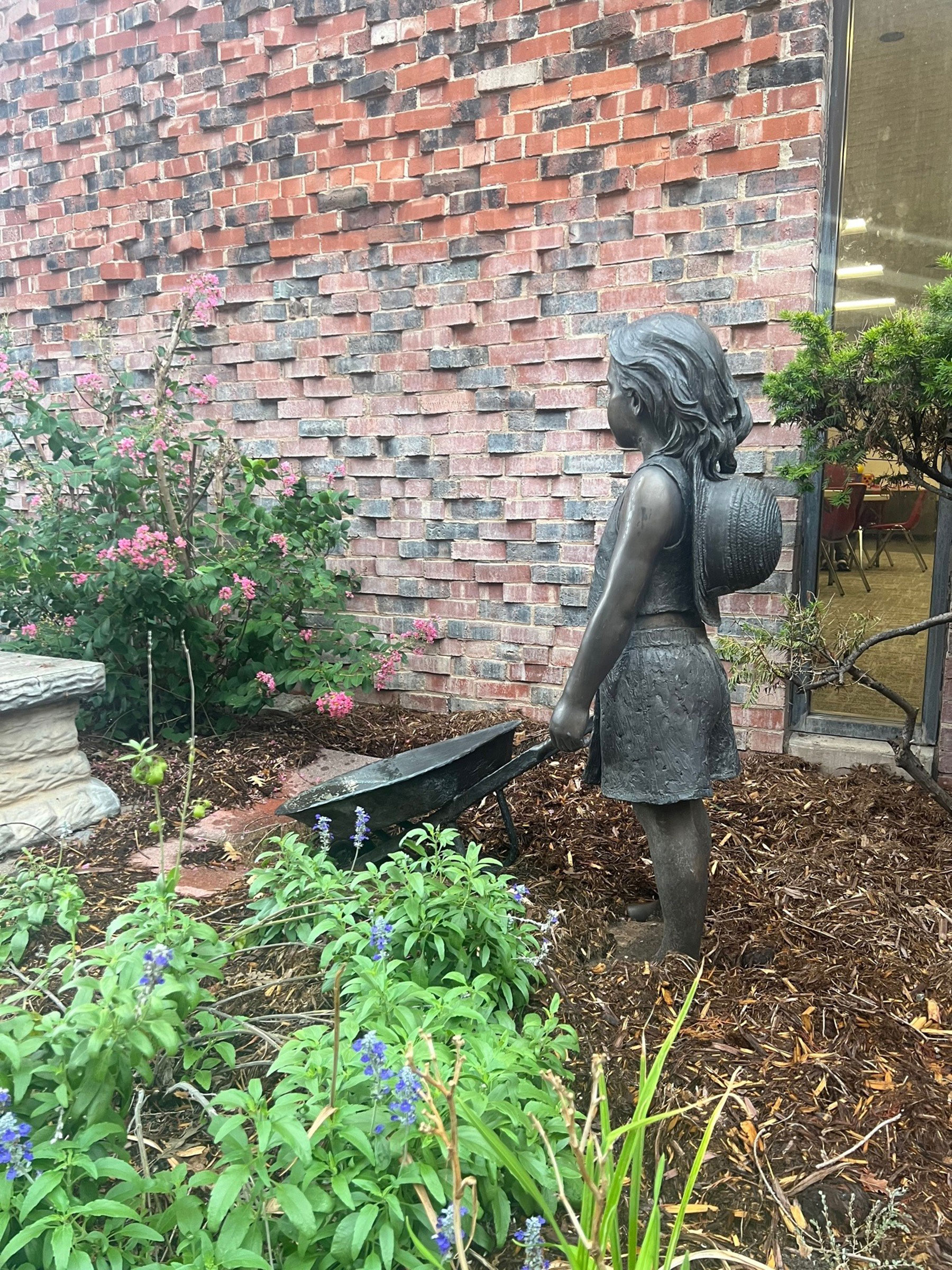 "Harvest Time" a bronze by L'Deane Trueblood was donated to the First Christian Church in 2014. A privately owned sculpture of a girl with her wheelbarrow and summertime outfit, ready to help in the garden.