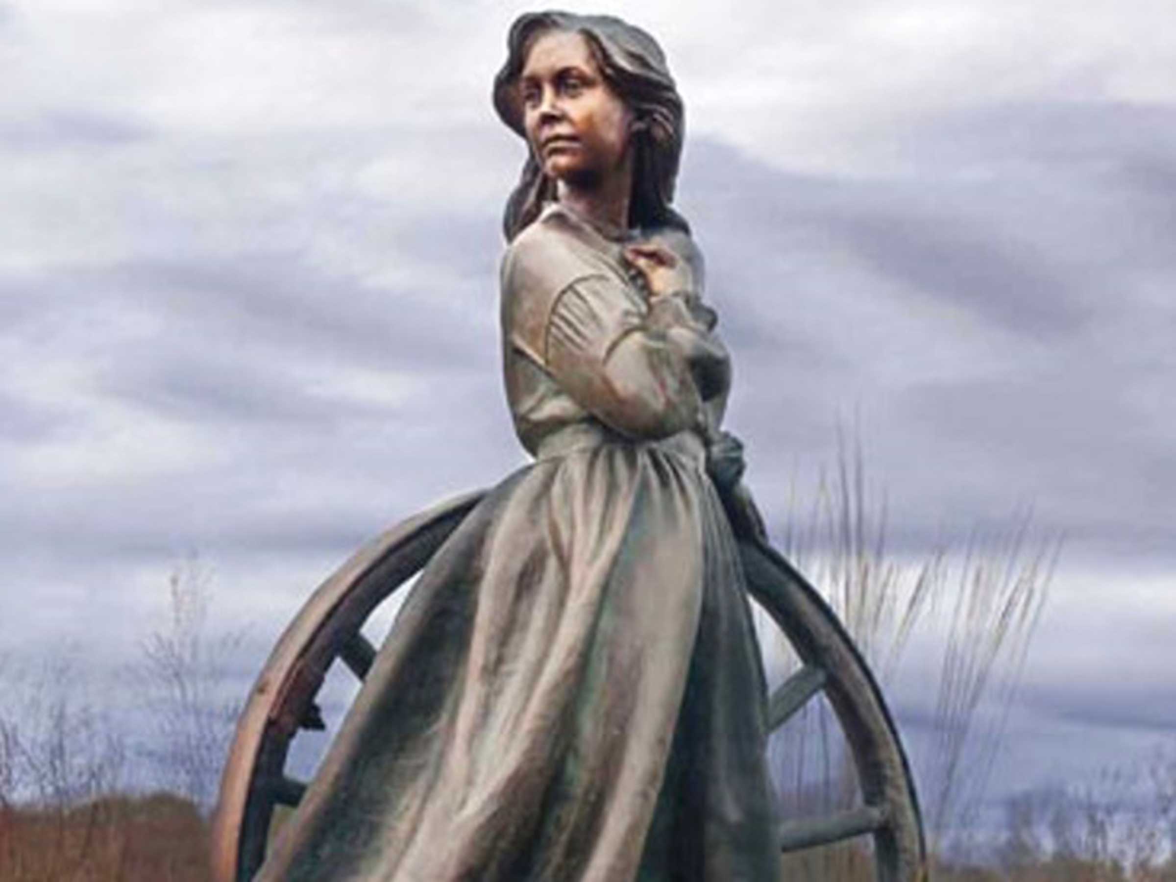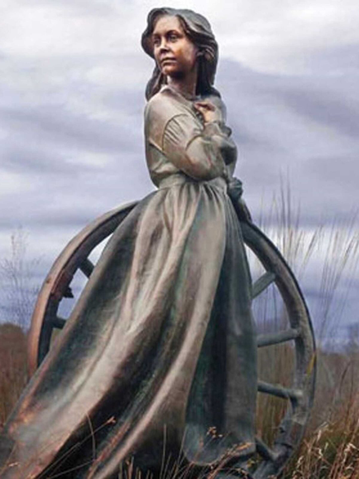 “No Turning Back” is a bronze sculpture of a frontier woman in front of a wagon wheel by Veryl Goodnight. The woman is depicted as persistent as she travels west because “There was absolutely No Turning Back.” Veryl started her art career as a wildlife painter but learned how to sculpt. Her works reflect her western roots. Her works have been featured in all major art magazines and her own book titled “No Turning Back- the Art of Veryl Goodnight” was published in 2011. This features the same-titled sculpture on its cover and is a guide to her career, approach to art, and compilation of her artworks. This piece was purchased through the Edmond Visual Arts Commission (EVAC) with a private donor/public matching fund program called Art in Public Places in partnership with an anonymous donor.
