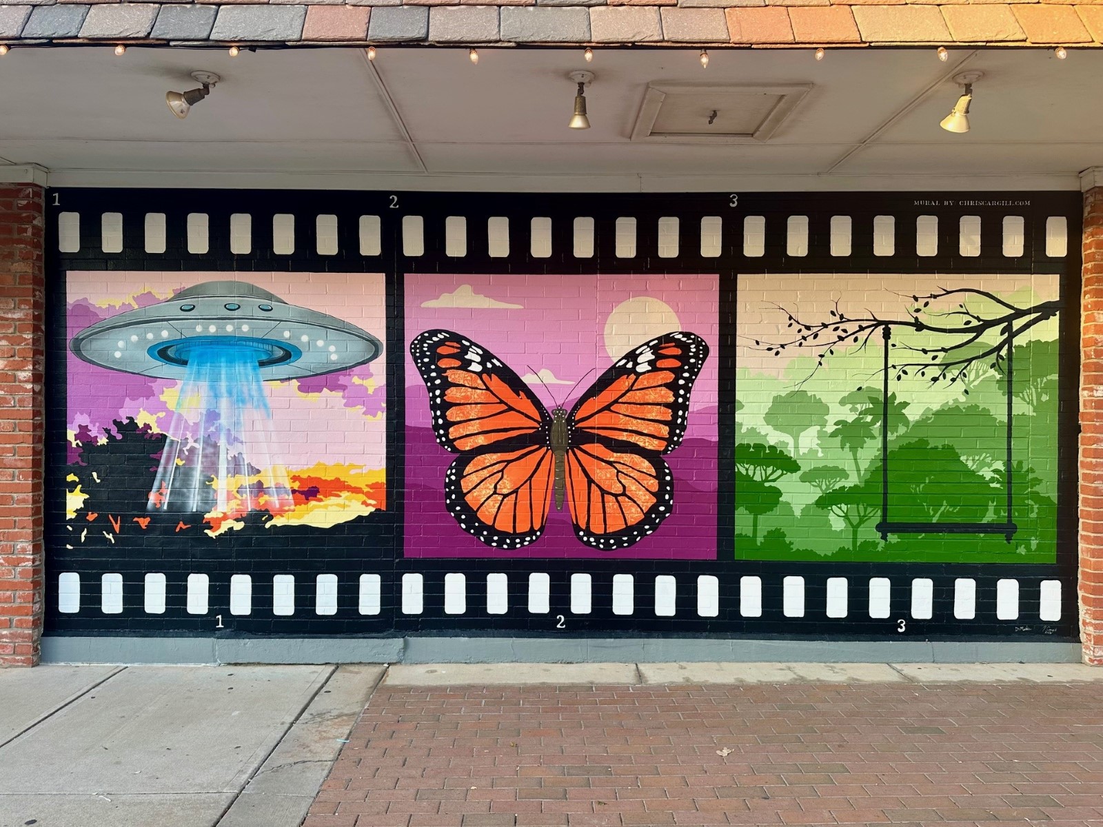 Local artist Chris Cargill created “Picture This” as a playful invitation to step into the art. Designed as the perfect selfie spot, the mural offers something for everyone — from a tree with a swing to relax beneath, to a butterfly ready to give you wings, and even a spaceship to launch your imagination into space. It’s a joyful celebration of creativity, curiosity, and connection. Purchased through the Edmond Visual Arts Commission (EVAC) with a private donor/public matching fund program called Art in Public Places in partnership with Steve Gibson and Trinity Mercantile.