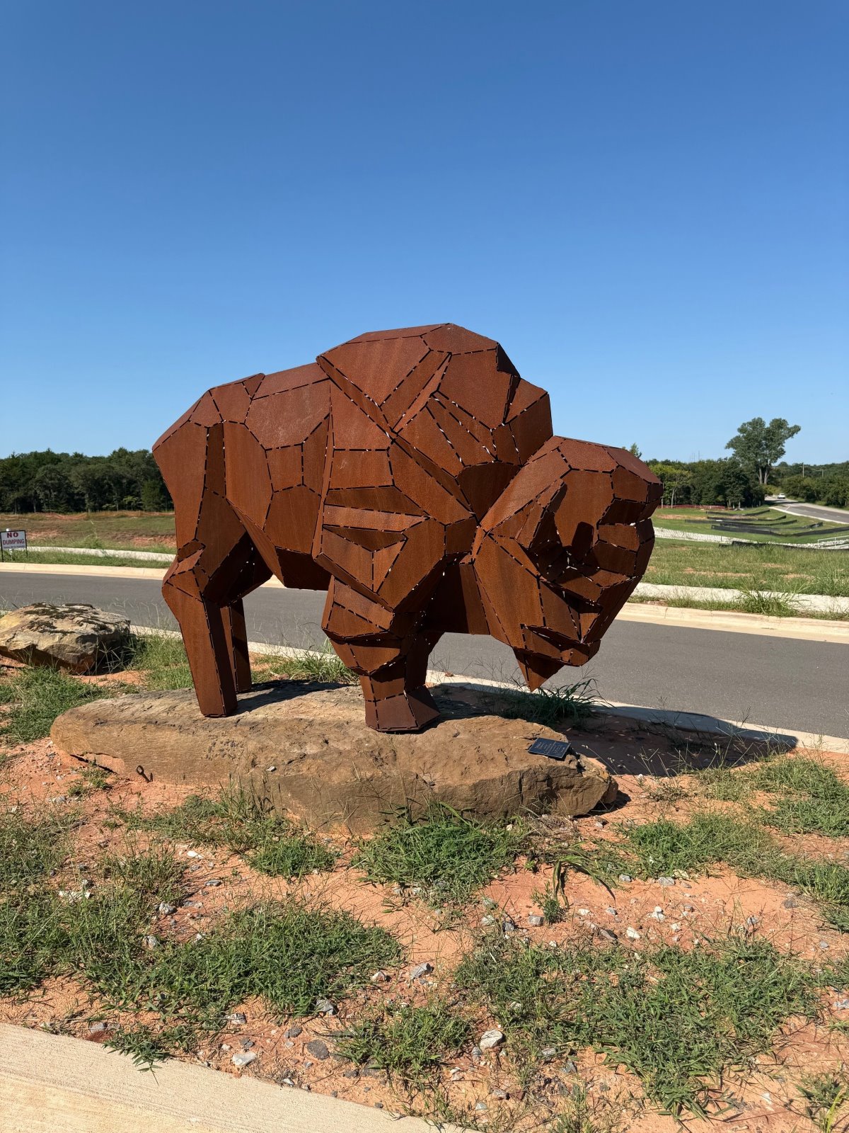 "Tatanka" a Corten-steel, origami-style bison by artist Bruce Gueswel. Acquired in loving memory of Neal McCaleb (1935-2025) through the Edmond Visual Arts Commission (EVAC) in partnership with Terri and Caleb McCaleb.