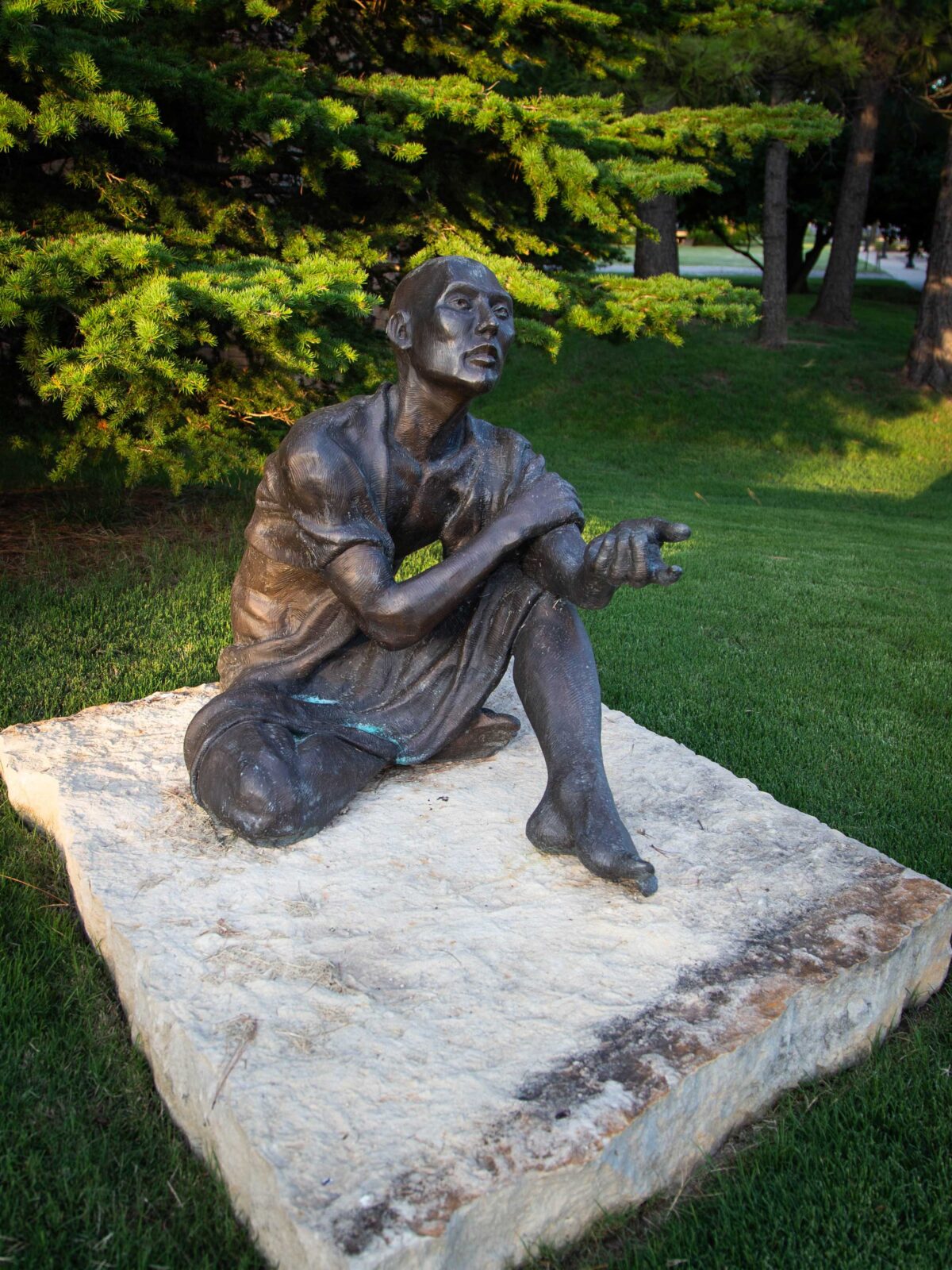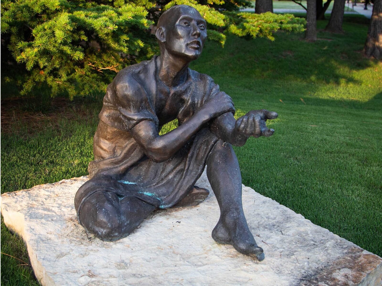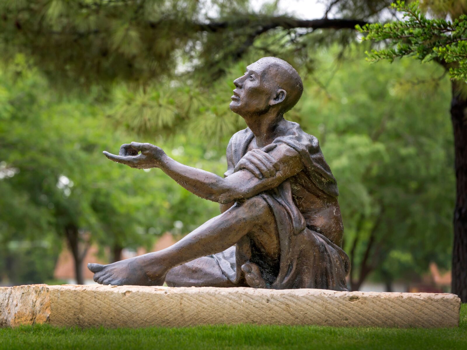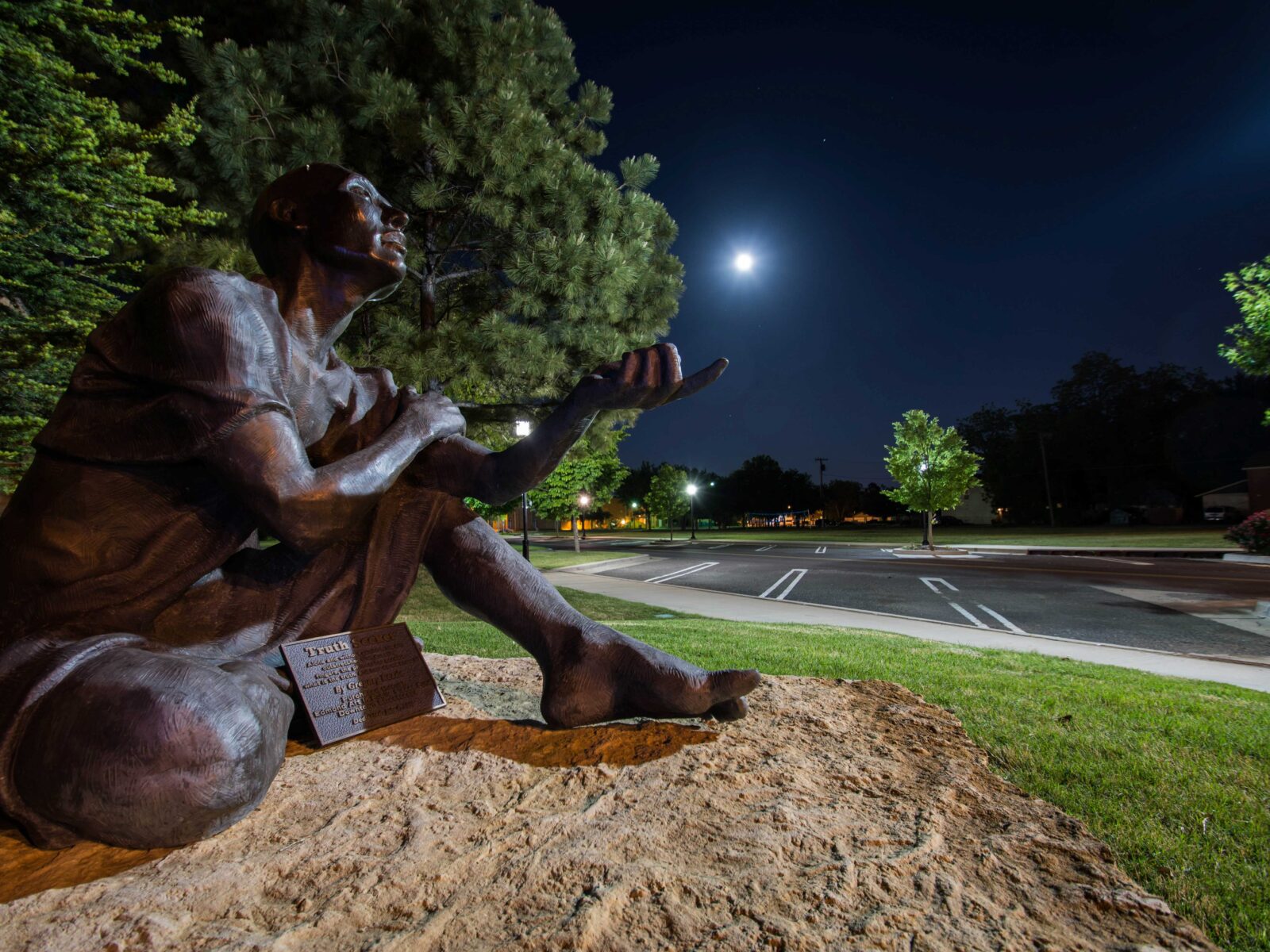 “Truth Seeker,” by Gregory Reade, was purchased with one percent Construction Improvement Project (CIP) funding through the Edmond Visual Arts Commission. This bronze sculpture depicts a philosopher sitting in a state of wonder, with his fingers outstretched, pondering the question: What is the truth, and how do we know? It sits on the northeast corner of Boulevard and Campbell and was installed in 2010.